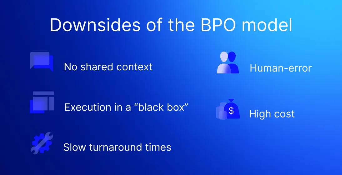 Slow turnaround times, no shared organizational context, “black box” execution - it’s an error prone model. Sure, BPO used to be the only viable path for lean fund teams. But we’re not living in the 80s anymore, and quite frankly, the model hasn’t evolved much since then. If you’re still relying on offshored labor performing manual tasks through fragmented tools, your fund will soon start falling behind.